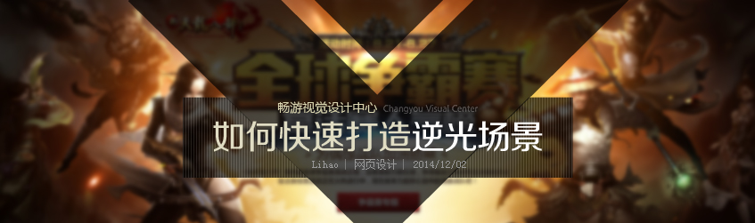 先对文字按照主次关系进行排版,这里同样最好采用居中的形式。“全球争霸赛”这几个字是同事之前做好的变形,我这里直接拿来用了,文字变形不是本次教程的重点,所以这里不做详细介绍,感兴趣的可以看下畅游VC关于文字变形的教程。文字排好之后就用钢笔工具在文字的下面层勾出黑底轮廓,这个可以有多种形式,画工比较好的同学可以勾出非常牛逼的底,这里我只做了轻微的处理(很显然我不是画工非常好的同学),给边角处加了一些出来的尖,使其看起来显得比较尖锐。