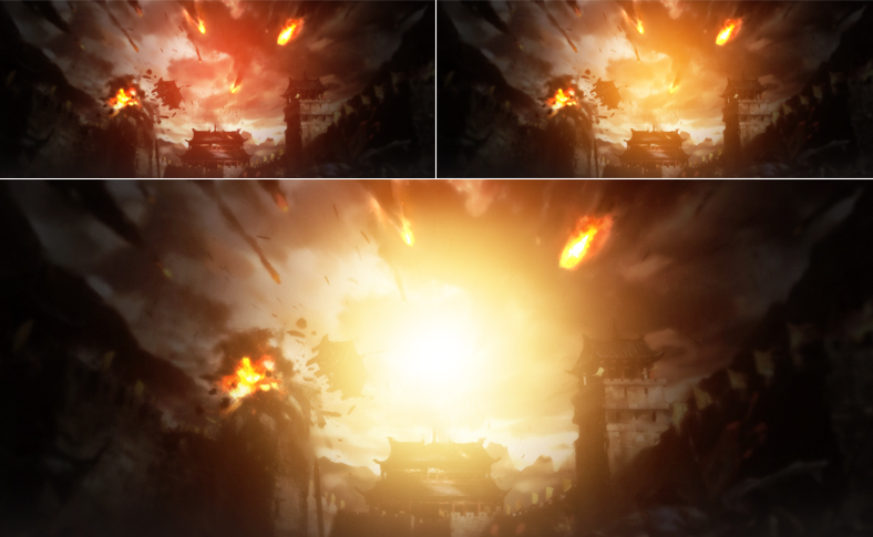 这里在对画面进行压暗处理的时候,并没有对画面本身具有的火球、爆炸火焰等进行相应处理,这些本身的火光后期可以利用,所以不用进行压暗,在处理的时候应该在蒙版上擦除这一部分。框内蒙版上的黑色区域即为火光部分,保留。
