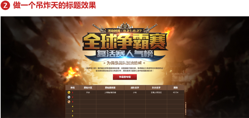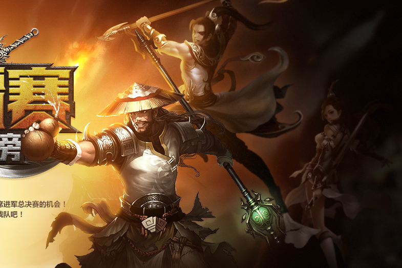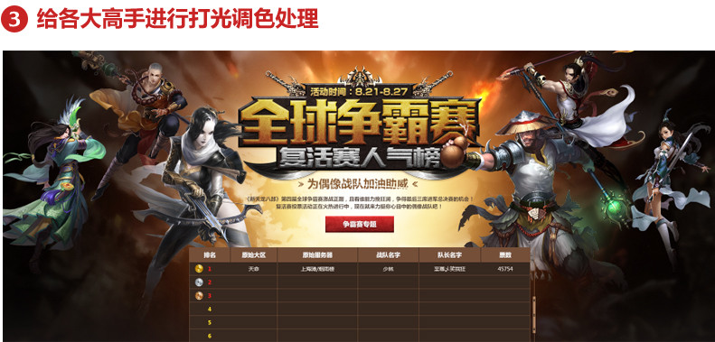 这是一个天龙全球争霸赛复活赛的专题页面,这里也许有人会有疑问,为什么不把复活赛重点突出,这是跟需求方沟通之后的结果,通过他们了解到主要还是以争霸赛为主体,复活赛作为副标即可(前期沟通很重要)。OK,既然主题”全球争霸赛“很明确,那我们就可以围绕这个去进行专题的构思了。首先,还是在脑海里想象下所要打造的一个大概的场景。各路英豪争夺全球第一,反映到游戏中自然也就是各门派的英雄去争夺武林盟主的感觉,可以把英雄围绕四周,中间放一个类似奖牌的物品,那么大致的场景及场面基调也就可以定下来了。我们还是先提炼一下关键词: