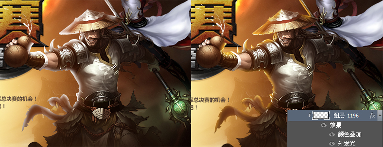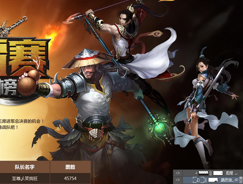 大家有没有注意到,在复活赛人气榜那里加的是蓝色的光,所以呢下面的两片大刀刃我们也应该加上相应的环境色,这样看起来才更加真实。方法很多,只要你能给我们的刀刃添加一些蓝色系即可,相信通过这篇教程中提到的调色方法,大家应该都可以做到了。还有一点就是大家有没有注意到弓箭女和葫芦娃是在中间文字标题的前面的,因为她(他)俩有一些元素是挡住了标题的,但是却不影响标题的阅读,这样呢就给画面一个前后关系,同样也帮助我们拉开了空间感。