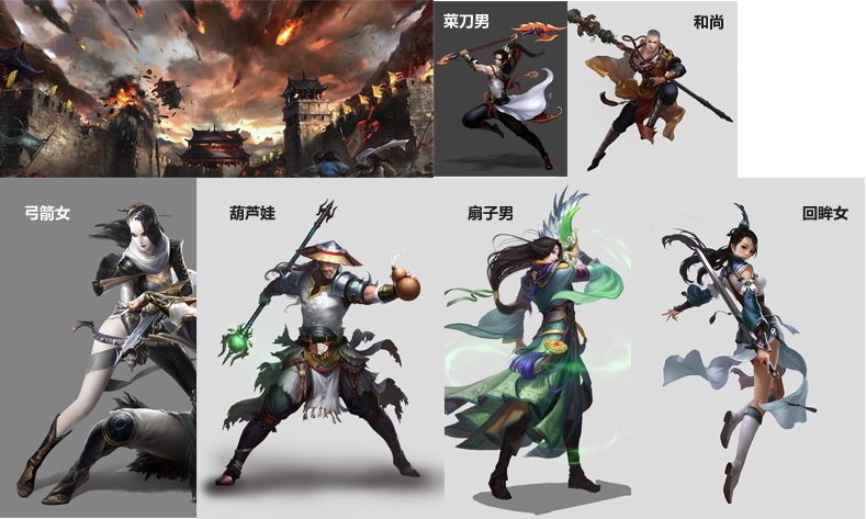 先把我们找的六大高手按照动作的对应关系调整大小比例和进行水平翻转,以达到画面的平衡和谐。这里大致介绍一下:弓箭女和葫芦娃都是属于正面微偏一点的,面部有略微的朝向,所以选取他(她、它)俩作为正前方主要人物;和尚和菜刀男都是属于跳跃飞起的感觉,所以在排列的时候略微高于主人物,而他俩姿势正好呼应,真不愧为好基友;扇子男和回眸女俩人都是明显的侧身,身体所占比重不大,所以缩小放置最两边(谁让你俩不正面相待,打入冷板凳)。